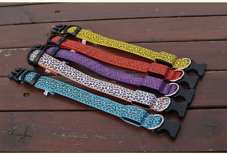 This adjustable LED dog collar features a leopard print design combined with a light-up function for use during evening walks and low-light conditions. It is designed as a practical accessory for everyday outdoor activities.